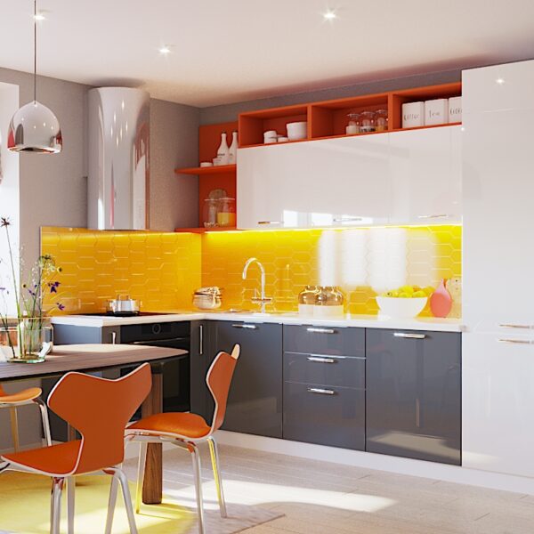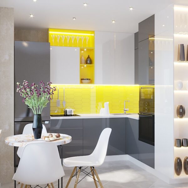 Строгость формы и многообразие цветов – основа для воплощения проекта в стиле минимализма и модерна, который идеально подходит для небольших кухонь. За счет обилия глянцевых поверхностей достигается оптический эффект расширения пространства.