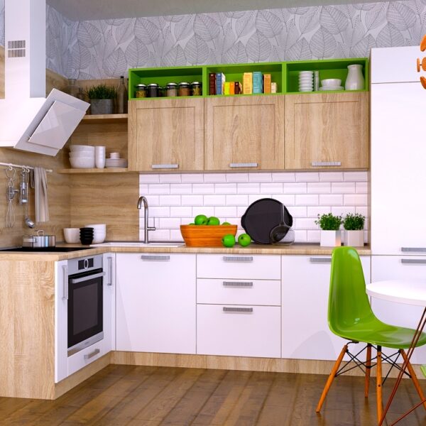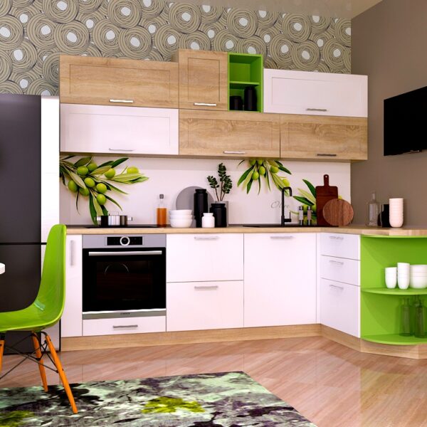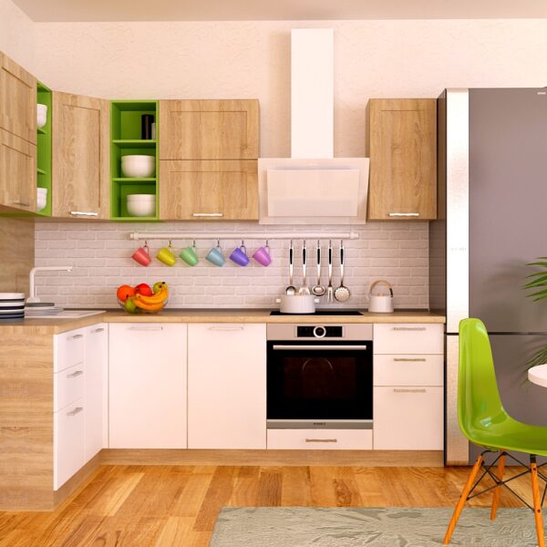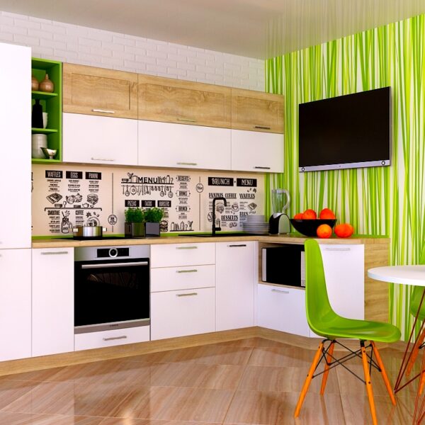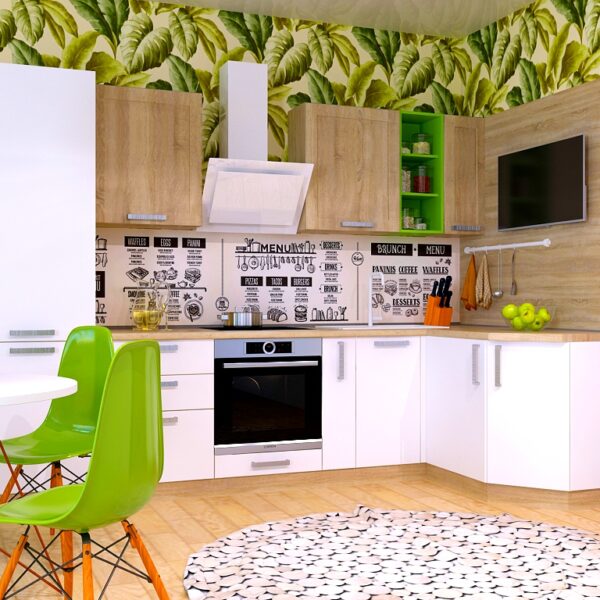 Природная красота натурального оттенка дуба в сочетании с белым — это беспроигрышный вариант при выборе своей кухни. А нотка зеленого лайма дает ощущение весенней свежести, радости и одновременно умиротворения.