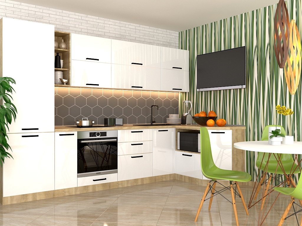 Модель Бьянка 12 с искусными фасадами подарит отличное настроение любой хозяйке. Для фасадов этой модели используются цвета белый и светлый бук, тем самым задав интересные акценты. Поверхность фасадов имеет благородный и элегантный вид. Все это создает атмосферу уюта. Отсутствие лицевой фурнитуры на верхних модулях формирует стильный дизайн, визуально расширяет помещение. За кухней легко ухаживать. Угловая планировка очень удобна. Она будет уместна и в большом, и в маленьком помещении. Такая кухня представляет собой треугольную зону где мебель и техника располагаются у смежных стен. Эта кухня белая. Психологи утверждают: белый — это символ счастья, невинности и чистоты. В цветотерапии с его помощью лечат тревожные расстройства и депрессии. Эта кухня имеет небольшие размеры и удачно вписывается в небольшие площади. Например, размеры этой кухни идеальны для хрущевки. Одним из популярных городских стилей интерьера является модерн. Он сочетает в себе современные достижения и природные мотивы, пропагандирует простор, лёгкость, минимализм. Этот стиль подходит для всех комнат, вне зависимости от их форм и размеров. Используется он и для оформления помещения, предназначенного для приготовления пищи. Кухня в стиле модерн выглядит просторной, стильной, модной. Кухня с глянцевыми фасадами приобретает стильные и современные штрихи. Любые тона начинают смотреться очень выразительно из-за привлекательного глянцевого блеска.