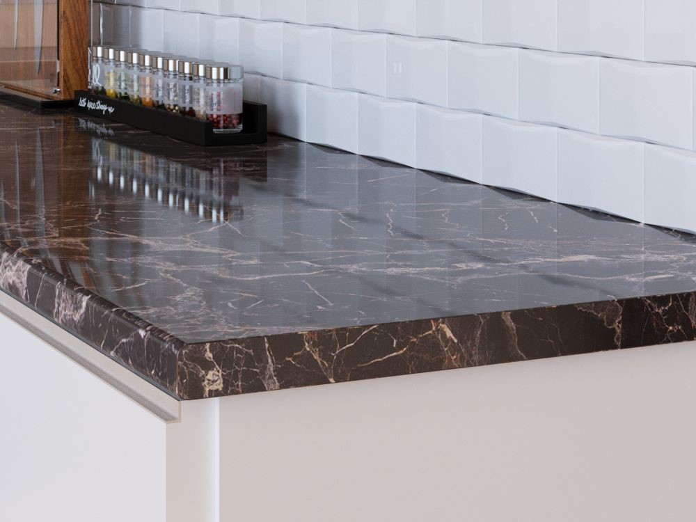 Столешница Мрамор марквина черный является общепризнанным классическим решением. Материал поверхности придает прохладность и матовость на ощупь. Имеет высокую термостойкость к горячим предметам.