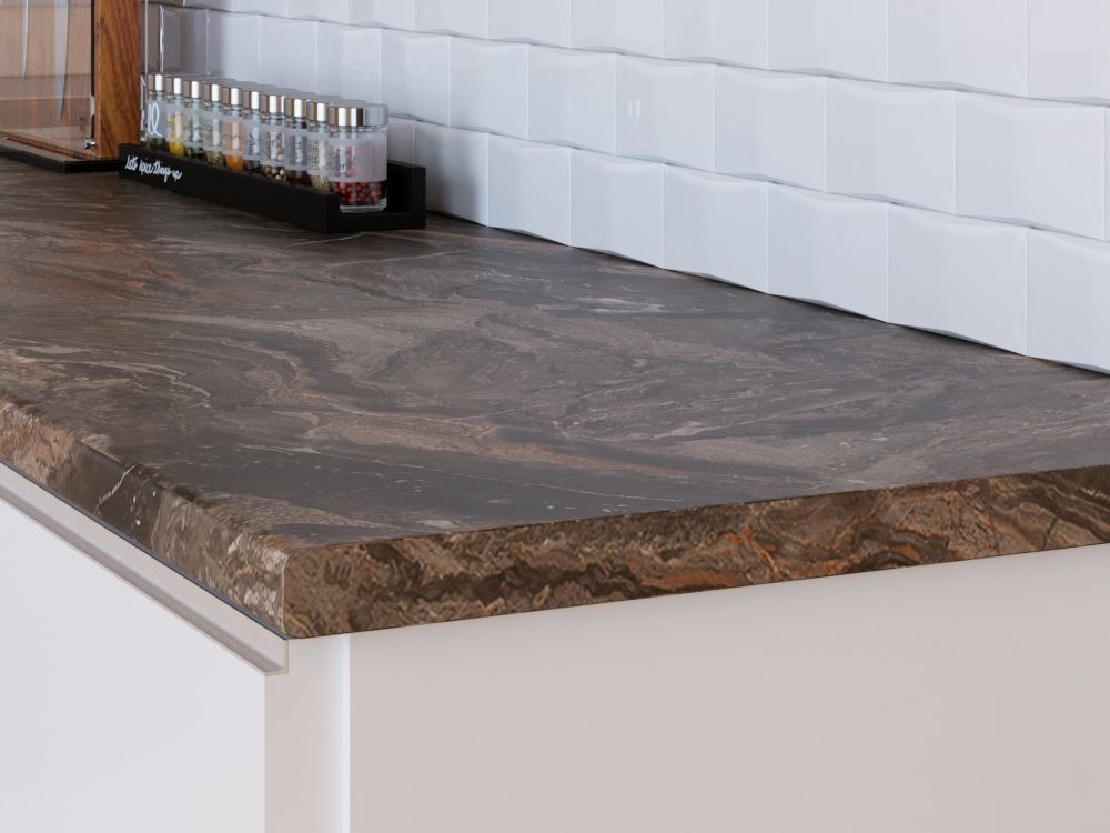 Столешница Мрамор бергамо темный является общепризнанным классическим решением. Цвет и материалы столешницы подбираются так, чтобы они были гаромничны дизайну кухонного гарнитура. Имеет высокую термостойкость к горячим предметам.