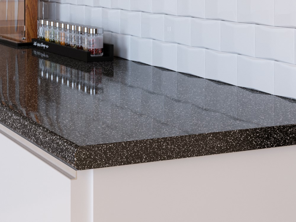 Столешница Черный кристалл имеет поверхность устойчивую к истиранию, ударной нагрузке, образованию царапин и защите от брызг. Цвет и материалы столешницы подбираются так, чтобы они были гаромничны дизайну кухонного гарнитура. Устойчива к образованию пятен, проста в очистке.