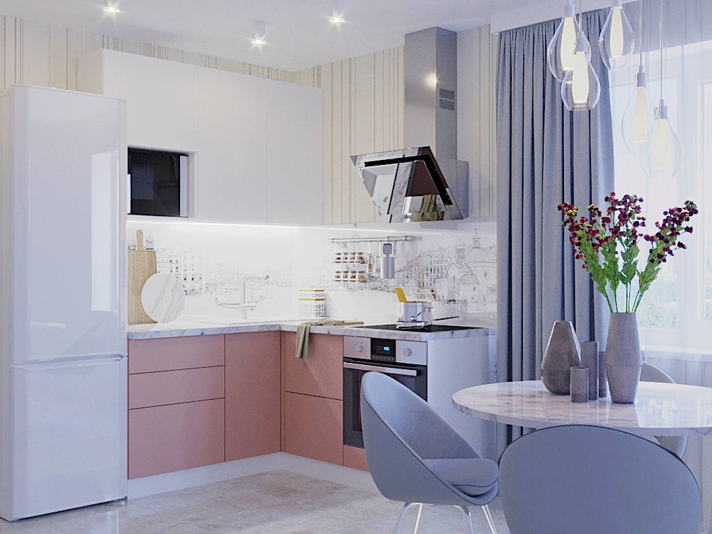 Дизайн гарнитура Аврора 4 выглядит поистине очаровывающе. Любая линия в нем грациозна и неповторима. Фасады выполнены по оригинальной технологии, специальное покрытие делает цвет глубоким и позволяет легко ухаживать за поверхностью. Рабочая зона может быть организована в виде очага с вытяжкой в едином стиле со всей композицией. Это все позволяет преобразить вашу кухню в роскошный зал для приема гостей. Благодаря большому количеству ящиков и шкафчиков угловая конструкция является наиболее вместительным вариантом, позволяющим обеспечить комфортное хранение посуды и бытовой техники. Розовый цвет обладает множеством оттенков, оказывает успокаивающее действие и придает помещению легкости. Благодаря этим свойствам интерьер может получиться спокойным и нежным, либо ярким и жизнерадостным. Эта кухня имеет небольшие размеры и удачно вписывается в небольшие площади. Например, размеры этой кухни идеальны для хрущевки. Каждый стиль имеет свои неповторимые особенности. Кухни в стиле модерн славятся необычным оформлением самых простых и привычных человеку предметов. Здесь продумана каждая деталь до мелочей. В этой модели используются матовые фасады - они очень практичны, немаркие и за ними очень легко ухаживать. На них не остаются видимыми отпечатки пальцев.
