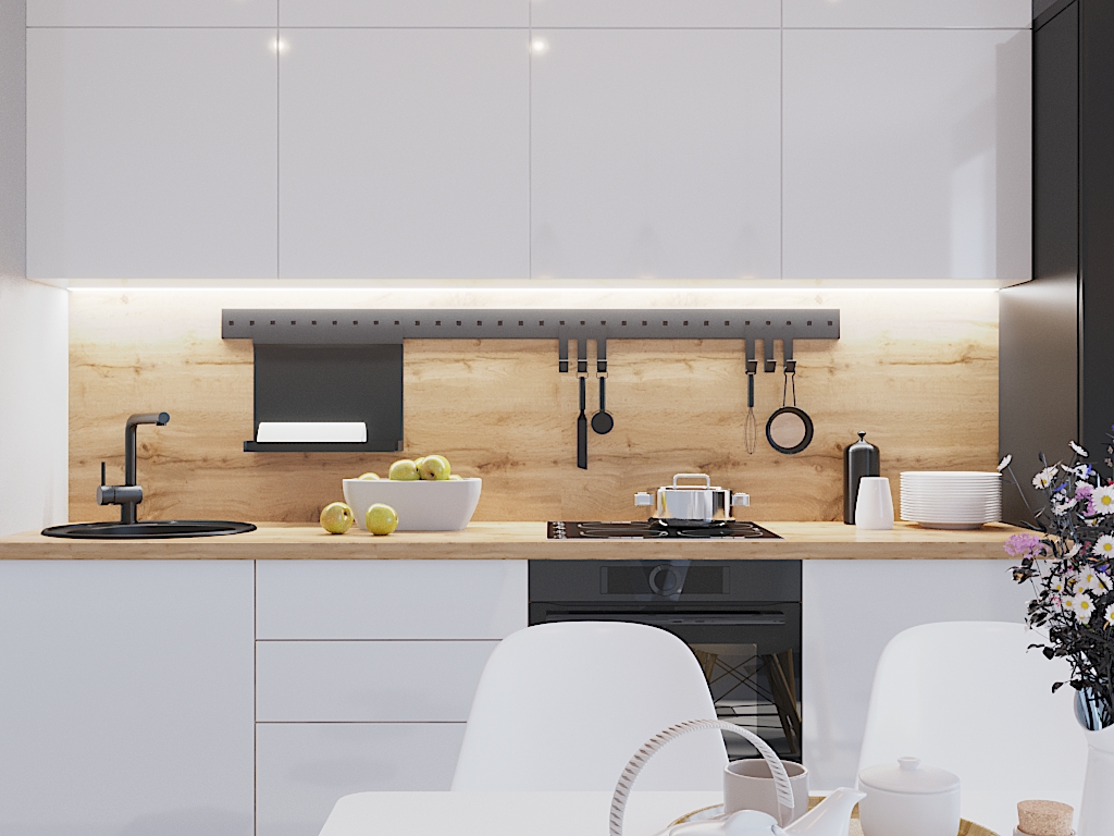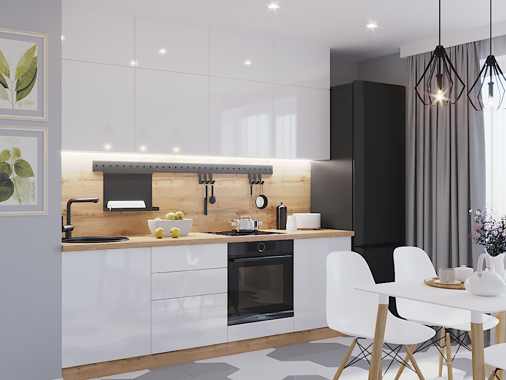 Добавьте акценты в виде черных аксессуаров, а именно: черная мойка и смеситель, рейлинги с крючками и полкой для специй, используйте черную бытовую технику. Таким образом вы создадите идеальное, стильное кухонное пространство, которое будет радовать Вас долгие годы.