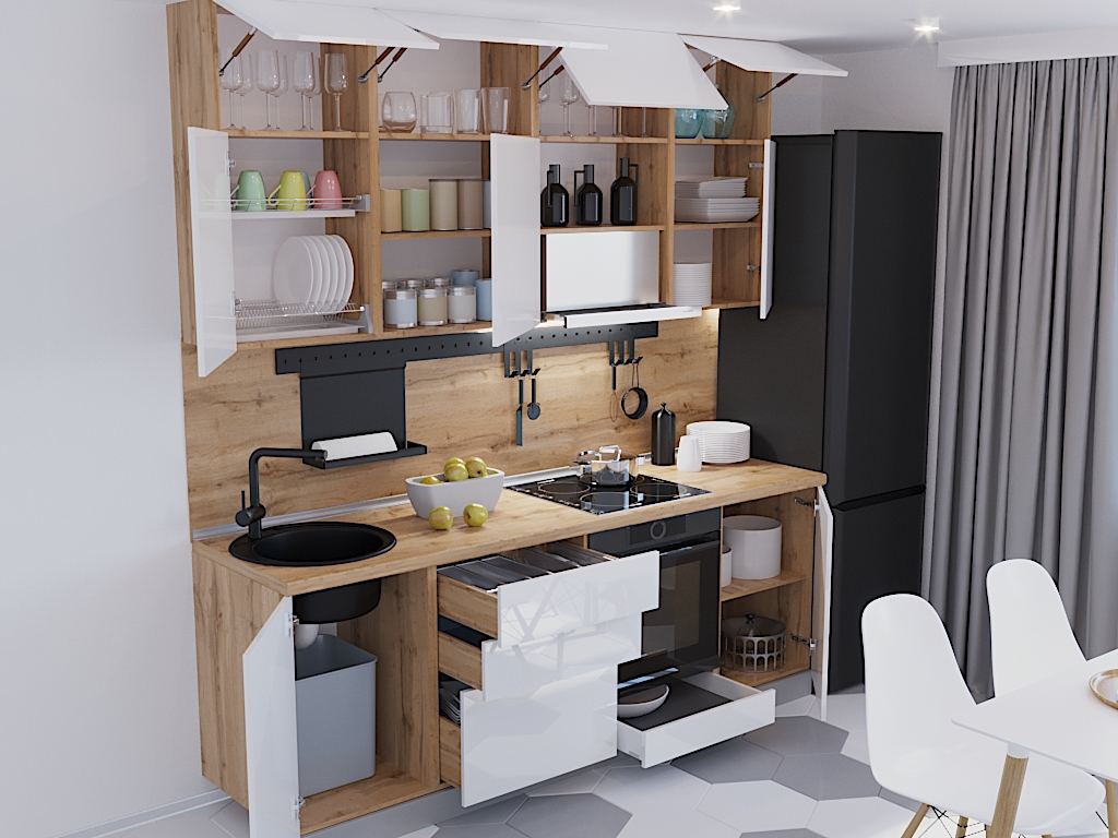 Перед покупкой вы можете посмотреть 3D модель кухни в вашем пространстве, чтобы идеально подобрать ее к вашему дизайну интерьера.