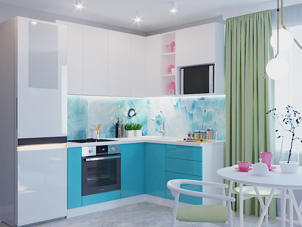 Гарнитур Кухня Бриз 2 лаконичен, идеальное сочетание цветов и ничего лишнего. Здесь используются цвета голубой и белый — это позволяет спроектировать выразительную композицию и дарит чувственное восприятие линий. Палитра натуральной цветовой гаммы, позволяют создать современный интерьер, утоляя при этом все нарастающее стремление к совершенству. Благодаря большому количеству ящиков и шкафчиков угловая конструкция является наиболее вместительным вариантом, позволяющим обеспечить комфортное хранение посуды и бытовой техники. Это кухня небольшая, но даже здесь можно создать идеальное место для семейных ужинов, посиделок с друзьями и приготовления своих кулинарных шедевров. Стиль модерн предполагает зонирование пространства и контраст. Здесь можно использовать все – потолки разного уровня, различные покрытия для пола, барные стойки. Чередование гладких и шероховатых фактур, самое необычное сочетание различных цветов, а также игра света – всё будет как нельзя кстати.