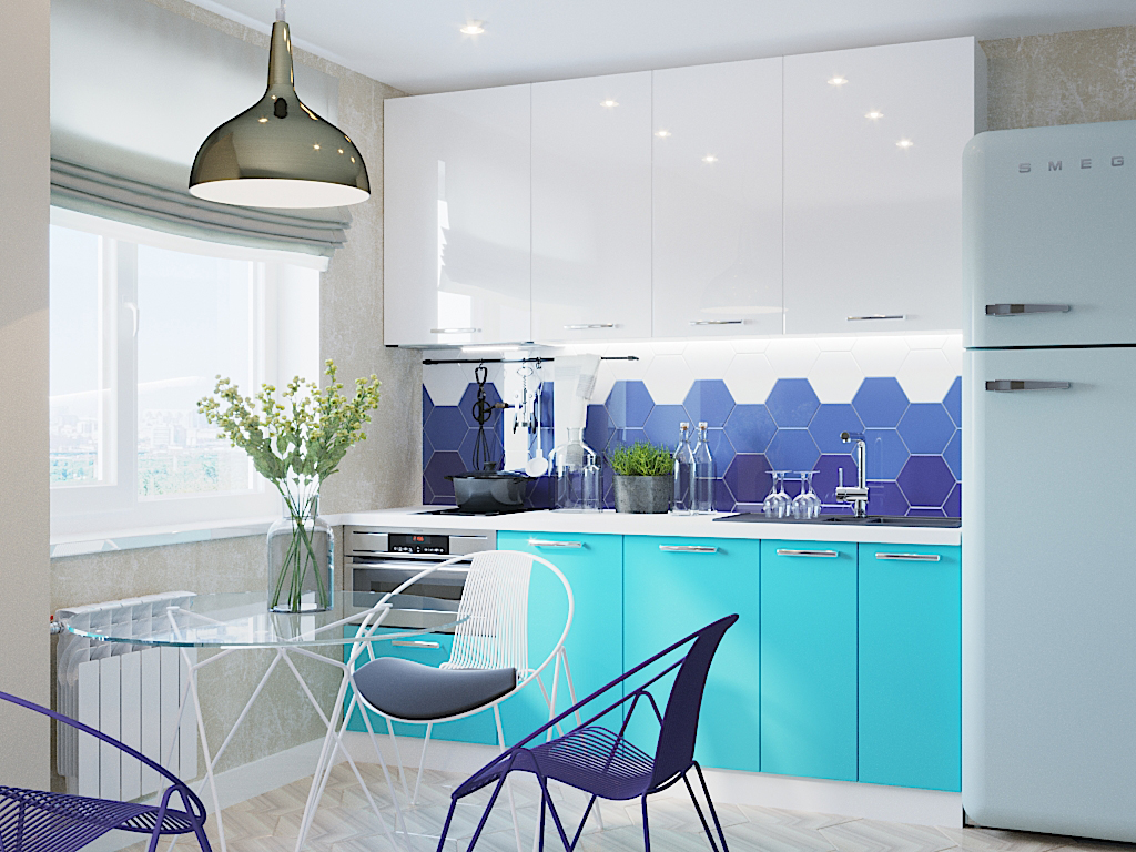 Дизайн гарнитура Кухня Бриз 9 лаконичен, идеальное сочетание материалов и ничего лишнего. Здесь используются цвета голубой и белый — это позволяет спроектировать элегантную композицию и дарит чувственное восприятие форм. Палитра натуральной цветовой гаммы, позволяют создать современный интерьер, утоляя при этом все нарастающее стремление к совершенству. В прямой кухне отсутствуют угловые шкафы, а, следовательно, до всего очень легко дотянуться. Стиль модерн предполагает зонирование пространства и контраст. Здесь можно использовать все – потолки разного уровня, различные покрытия для пола, барные стойки. Чередование гладких и шероховатых фактур, самое необычное сочетание различных цветов, а также игра света – всё будет как нельзя кстати.