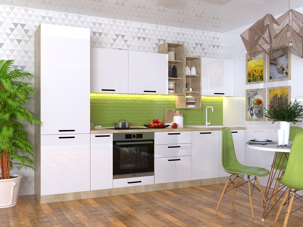 Обаяние вековых традиций кухонного дизайна в полной мере присутствуют в модели Бьянка 13.1, наполняя ее неповторимым изяществом. Определенно кухня Бьянка 13.1 будет смотреться искусно вне времени и моды, чем будет радовать Вас. В модели используются цвета белый и зеленый, это палитра очень практична и позволяет легко сочетать с яркими цветами элементов интерьера, текстилем и аксессуарами. Бьянка 13.1 для тех, кто любит сочетания гармоничных цветов. Прямая кухня является самой универсальной и компактной. Чистый и светлый дизайн интерьера белой кухни удачно смотрится в любом жилом помещении. Белый цвет — нейтральный, простой. Он не выходит из моды. Белая кухня впишется в каждый интерьер: от минимализма до помпезной классики. Основной акцент кухонных гарнитуров в стиле модерн – сделан на функциональности. Продуманный и эргономичный дизайн кухни модерн, а также множество вариантов расцветок фасадов и сочетаний различных материалов позволяют максимально структурировать пространство, сформировать необходимые функциональные зоны и создать в помещении универсальную обстановку. Покрытие фасадов глянцевое - на них могут остаться отпечатки рук, но это не беда, поскольку такие загрязнения выводятся без особых усилий.