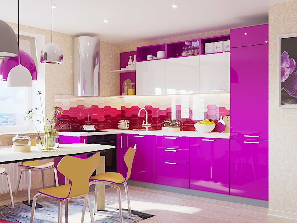 Модель Виола 10 сразу же привлекает внимание благодаря геометрически выверенным. Форма фасада Виола 10, которая использует весьма современный стиль, базируется на дизайне фасадов, характерных для Европы. Оставаясь при этом открытой к экспериментам, модель Виола 10 не диктует стиль – она помогает воплотить в реальность почти любое интерьерное решение, стоит только выбрать направление. В этом решении используются цвета фуксия и белый – и ваша кухня, словно базовый гардероб, – стильная и в то же время универсальная. Какой будет характер у кухни Виола 10 – решать только Вам! С точки зрения практичности и функциональности угловые кухни являются наиболее оптимальным вариантом размещения кухонной мебели. Одним из популярных городских стилей интерьера является модерн. Он сочетает в себе современные достижения и природные мотивы, пропагандирует простор, лёгкость, минимализм. Этот стиль подходит для всех комнат, вне зависимости от их форм и размеров. Используется он и для оформления помещения, предназначенного для приготовления пищи. Кухня в стиле модерн выглядит просторной, стильной, модной. В этой модели глянцевые фасады - они появились сравнительно недавно, но стали настоящим украшением современных и стильных кухонь. Глянец очень хорошо отражает свет, поэтому при желании можно до неузнаваемости зрительно изменить геометрию обустраиваемого пространства, расширить помещение.