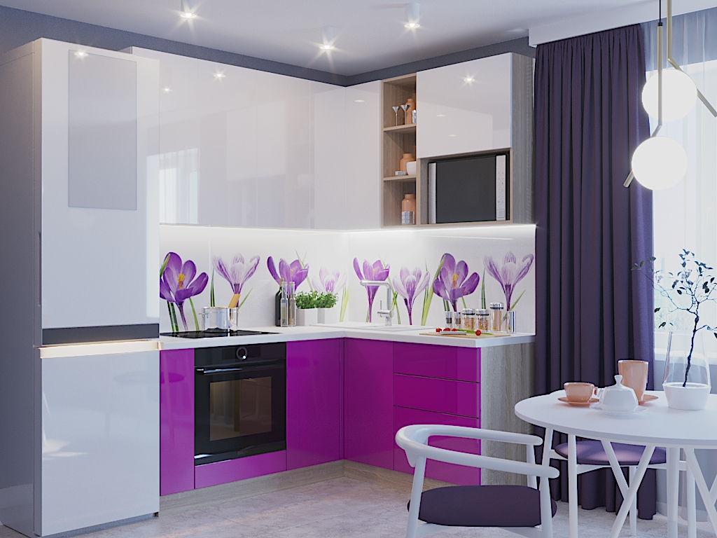 Дизайн гарнитура Виола 2 предельно сдержан, оптимальное сочетание материалов и ничего лишнего. Здесь используются цвета фуксия и белый — это позволяет спроектировать выразительную композицию и дарит чувственное восприятие линий. Древесные декоры натуральной цветовой гаммы, позволяют создать современный интерьер, утоляя при этом все нарастающее стремление к совершенству. Угловая планировка кухонного гарнитура позволяет рационально использовать угловое пространство. Дизайну в стиле модерн характерны асимметричность и чистые, плавные, изящные линии. Здесь наилучшим образом сочетаются декоративность и функциональность. Декорирование в этом стиле стремиться к упрощению, рациональности и эстетизму. В этой модели глянцевые фасады - они появились сравнительно недавно, но стали настоящим украшением современных и стильных кухонь. Глянец очень хорошо отражает свет, поэтому при желании можно до неузнаваемости зрительно изменить геометрию обустраиваемого пространства, расширить помещение.