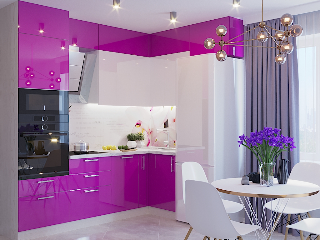 Дизайн гарнитура Виола 5 лаконичен, идеальное сочетание материалов и ничего лишнего. Здесь используются цвета фуксия и белый — это позволяет спроектировать элегантную композицию и дарит чувственное восприятие форм. Палитра натуральной цветовой гаммы, позволяют создать современный интерьер, утоляя при этом все нарастающее стремление к совершенству. Угловая планировка очень удобна. Она будет уместна и в большом, и в маленьком помещении. Такая кухня представляет собой треугольную зону где мебель и техника располагаются у смежных стен. Дизайну в стиле модерн характерны асимметричность и чистые, плавные, изящные линии. Здесь наилучшим образом сочетаются декоративность и функциональность. Декорирование в этом стиле стремиться к упрощению, рациональности и эстетизму. Кухня с глянцевыми фасадами приобретает стильные и современные штрихи. Любые тона начинают смотреться очень выразительно из-за привлекательного глянцевого блеска.