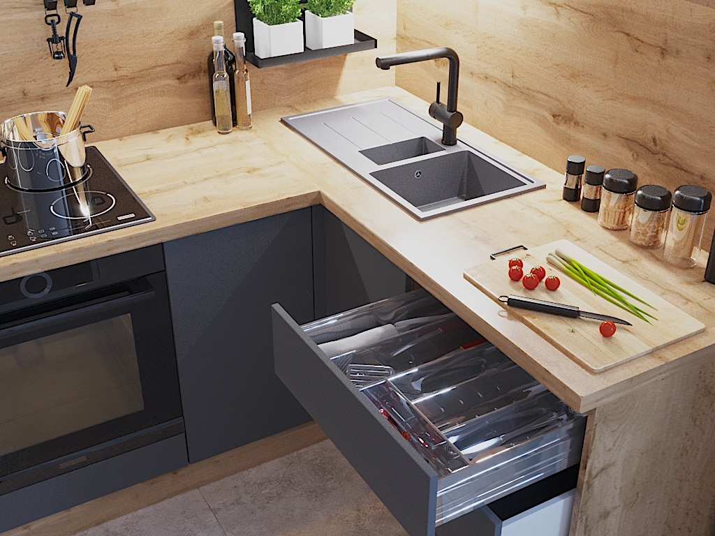 Кухня Грэй 2 - угловая кухня с древесным корпусом, древесной столешницей фасадами цвета антрацит. Размер кухни по левой стороне - 1800мм, по правой стороне - 1600мм. Высоту кухни Вы можете изменять за счет высоты навески верхних модулей, определяя тем самым высоту фартука. Высота навесных шкафов - 920мм,  во многих помещениях кухня будет смотреться до потолка. Материал фасадов - ЛДСП EGGER 16мм Антрацит. Для корпуса и столешницы мы предлагаем 3 варианта декора, а именно: Дуб бунратти, Дуб вотан или Дуб сонома. Столешница входит в стоимость кухни! Низ кухни оформлен цоколем в цвет корпуса. Цоколь также входит в стоимость кухни! Задние стенки кухни исполнены из материала ХДФ высокой плотности, способом установки в пазы (у модуля под духовой шкаф и мойку задние стенки не предусмотрены). Во всех моделях мы используем надежную фурнитуру Российских и Итальянских производителей. На ящиках установлены направляющие скрытого монтажа, выдерживающие до 60 000 циклов открывания/закрывания и несущей способностью до 25кг. Дно ящиков исполнено из ЛДСП. Модель Грэй 2 выполнена без ручек, все фасады и ящики открываются от нажатия. Данная модель кухни оснащена вместительной бутылочницей, шириной 200мм, которая также открывается от нажатия.