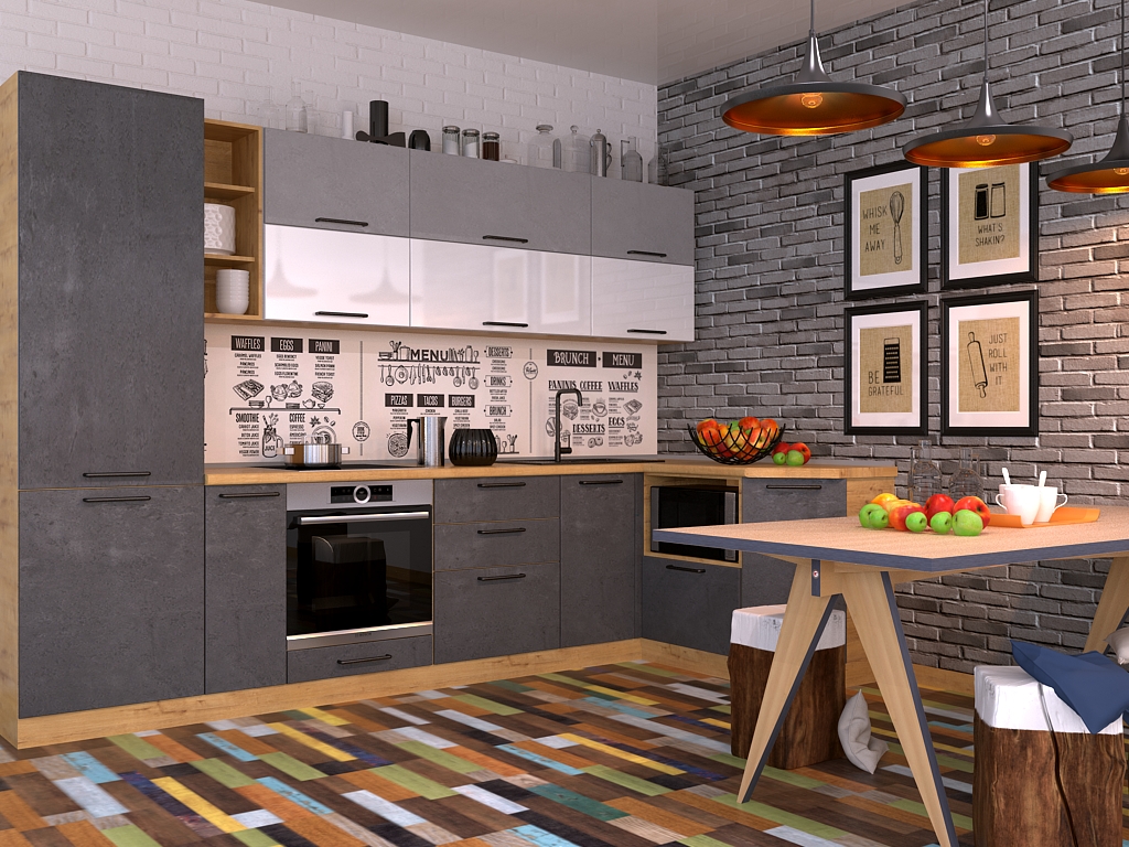 Дизайн гарнитура Чикаго 14 предельно сдержан, идеальное сочетание материалов и ничего лишнего. Здесь используются цвета серый и белый — это позволяет спроектировать элегантную композицию и дарит чувственное восприятие линий. Палитра натуральной цветовой гаммы, позволяют создать современный интерьер, утоляя при этом все нарастающее стремление к совершенству. Исполнение кухни угловое - оно удобно и практично. При помощи его пространство можно распределять наиболее эффективно. Серая кухня – необычное решение для комфортного и функционального помещения. Такой цвет воспринимается как символ индустриального города, утонувшего в смоге многочисленных фабрик и автомобилей. Но палитра серого оттенка достаточно разнообразна, кроме того она способна успокоить нервную систему человека. На большой кухне будет легче и проще реализовать любую идею, воплотить все мечты, сделать кухню удобной, наполненной всем необходимым, при этом уютной и милой. Кухня стиле лофт построена на контрастах. Сочетание изящной мебели и грубоватой отделки стен, контрастных тонов и материалов отделки, огромные окна и низкие светильники – всё это создаёт неповторимую атмосферу. Покрытие фасадов матовое - это означает, что фасады не оставляют отпечатков пальцев и очень легки в уходе.