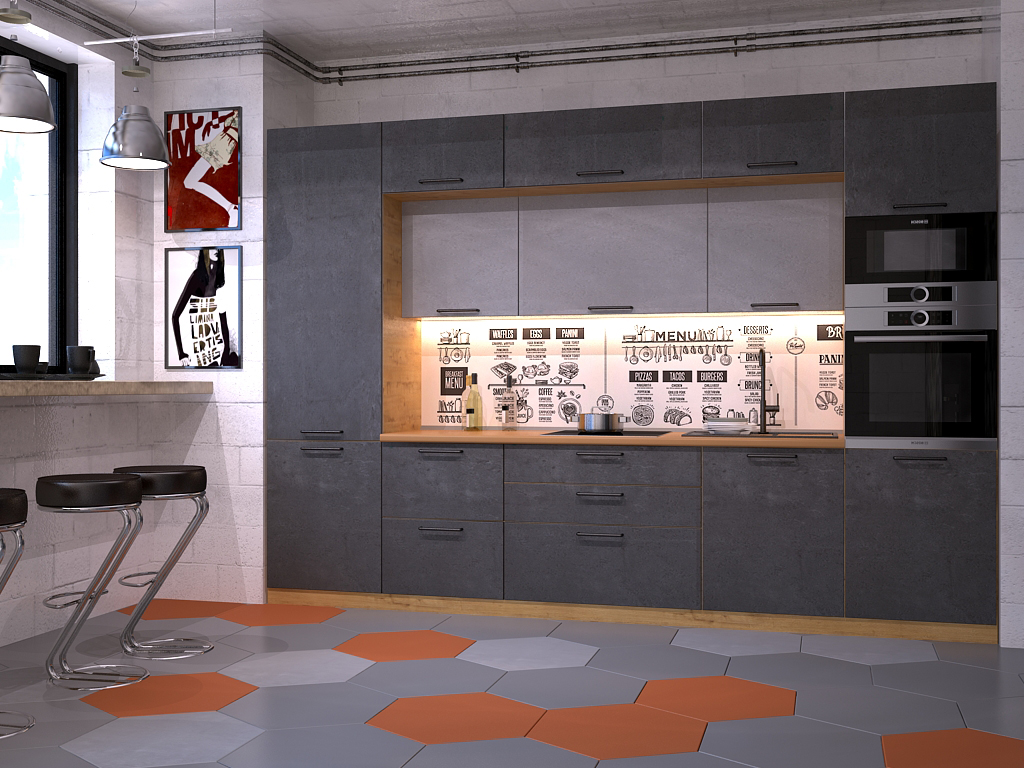 Кухня Чикаго 18 с изящными фасадами подарит великолепное настроение любой хозяйке. Для фасадов этой модели используются цвета графитовый и серый, тем самым задав интересные акценты. Покрытия имитируют фактуры природных материалов. Все это создает атмосферу уюта. Отсутствие лицевой фурнитуры на верхних модулях формирует стильный дизайн, визуально расширяет помещение. Корпус и фасады шкафов выполнены из ЛДСП. Прямая кухня является самой универсальной и компактной. Графитовый цвет для кухонной мебели дизайнеры считают универсальным. Он достойно смотрится в интерьере кухонного помещения. Кухня в стиле лофт – довольно популярная тенденция, она уходит своими корнями в эстетику старых складов, где хранились промышленные материалы или продукты. На кухне на первый план выходит индустриальное творчество. Особенность этой модели матовые фасады, они немаркие и не оставляют отпечатков пальцев. Такие фасады безупречный и яркий вид, более того, они оптимально сочетаются и гармонируют с различной кухонной мебелью.