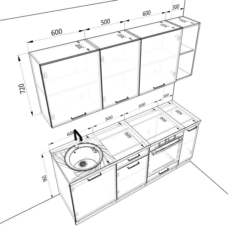В стоимость входит корпуса, фасады, столешница, фурнитура (направляющие/петли/опоры/навесы и планка для навески / крепеж), посудосушитель