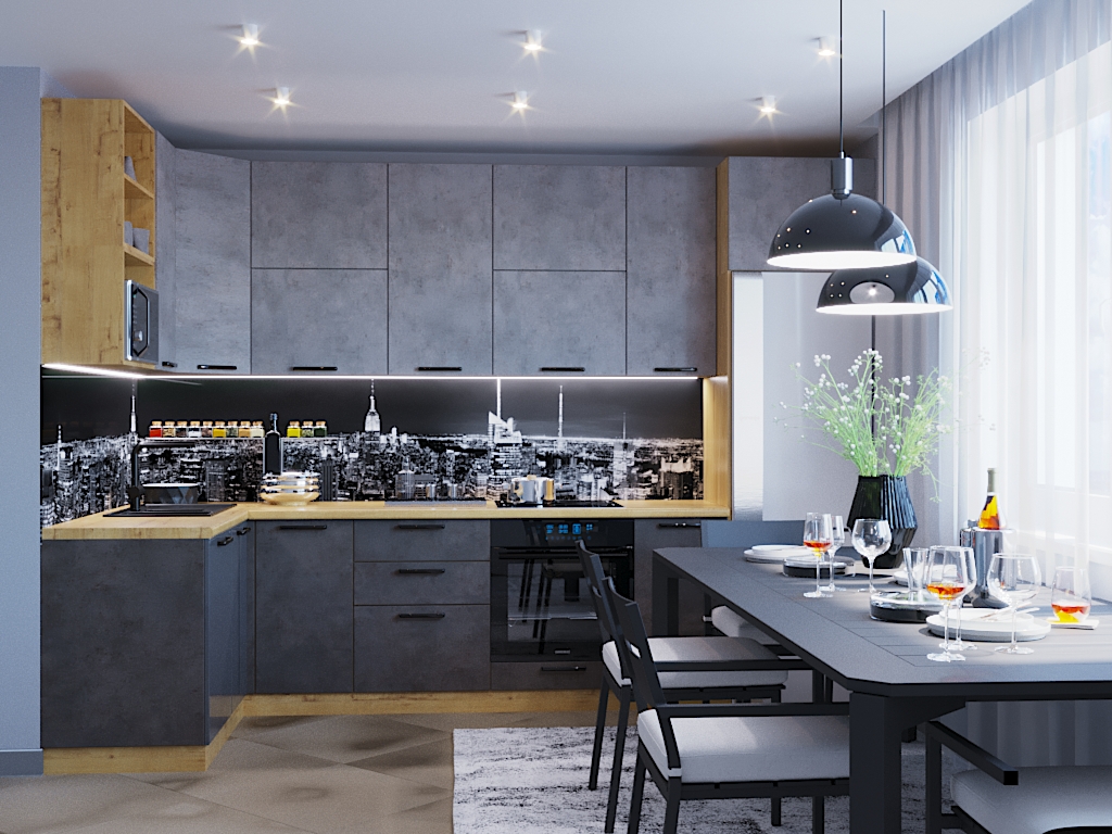 Кухня Чикаго 45 с изящными фасадами подарит хорошее настроение любой хозяйке. Для фасадов этой модели используются цвета графитовый и серый, тем самым задав интересные акценты. Поверхность фасадов имеет благородный и элегантный вид. Все это создает атмосферу умиротворения. Отсутствие лицевой фурнитуры на верхних модулях формирует стильный дизайн, визуально расширяет помещение. За кухней легко ухаживать. Угловая планировка кухонного гарнитура позволяет рационально использовать угловое пространство. Графитовые кухни — это сочетание современных модных тенденций с универсальностью. Это кухня большая - здесь всегда хватит места и для приготовления пищи, и для семейных ужинов, и для приема гостей. Кухня в стиле лофт — прекрасная идея для динамичных натур, не боящихся рисковать и живущих в ритме большого города. Подобный интерьер — настоящая кладовая самых смелых дизайнерских решений с использованием урбанистических материалов: кирпича, бетона, металла, пластика, стекла. Кухни лофт также предусматривают нестандартные планировки, нетрадиционное использование отделочных материалов, эргономичную расстановку мебели, смелую цветовую палитру и оригинальный декор. В этой модели используются матовые фасады - они очень практичны, немаркие и за ними очень легко ухаживать. На них не остаются видимыми отпечатки пальцев.