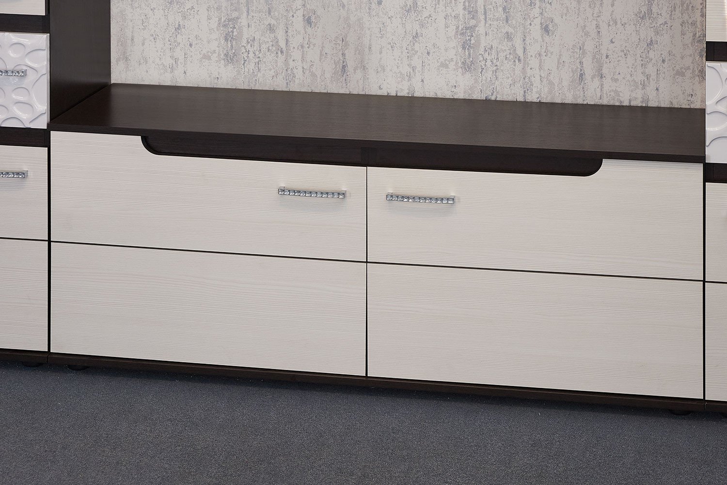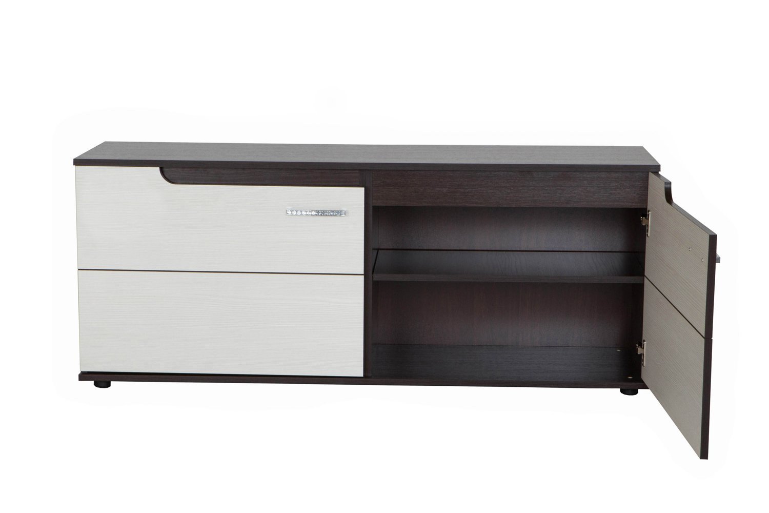 ТВ-тумба Виспа будет отличным дополнением интерьера любой комнаты. Изделие поможет разместить телевизор для более комфортного просмотра новостей, сериалов и различных телепередач. Вместительное внутреннее пространство пригодится для хранения большого количества различных вещей и предметов. Ее можно использовать как отдельный элемент, так и в сочетании с другими модулями гостиной. Для этой модели используются цвета венге и белый.