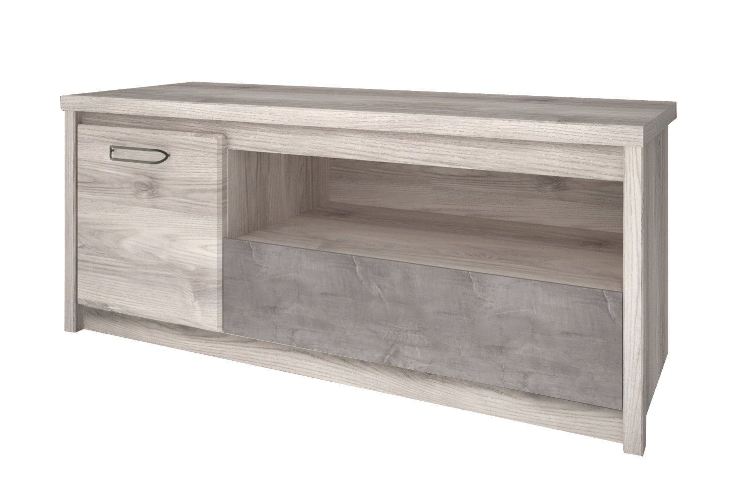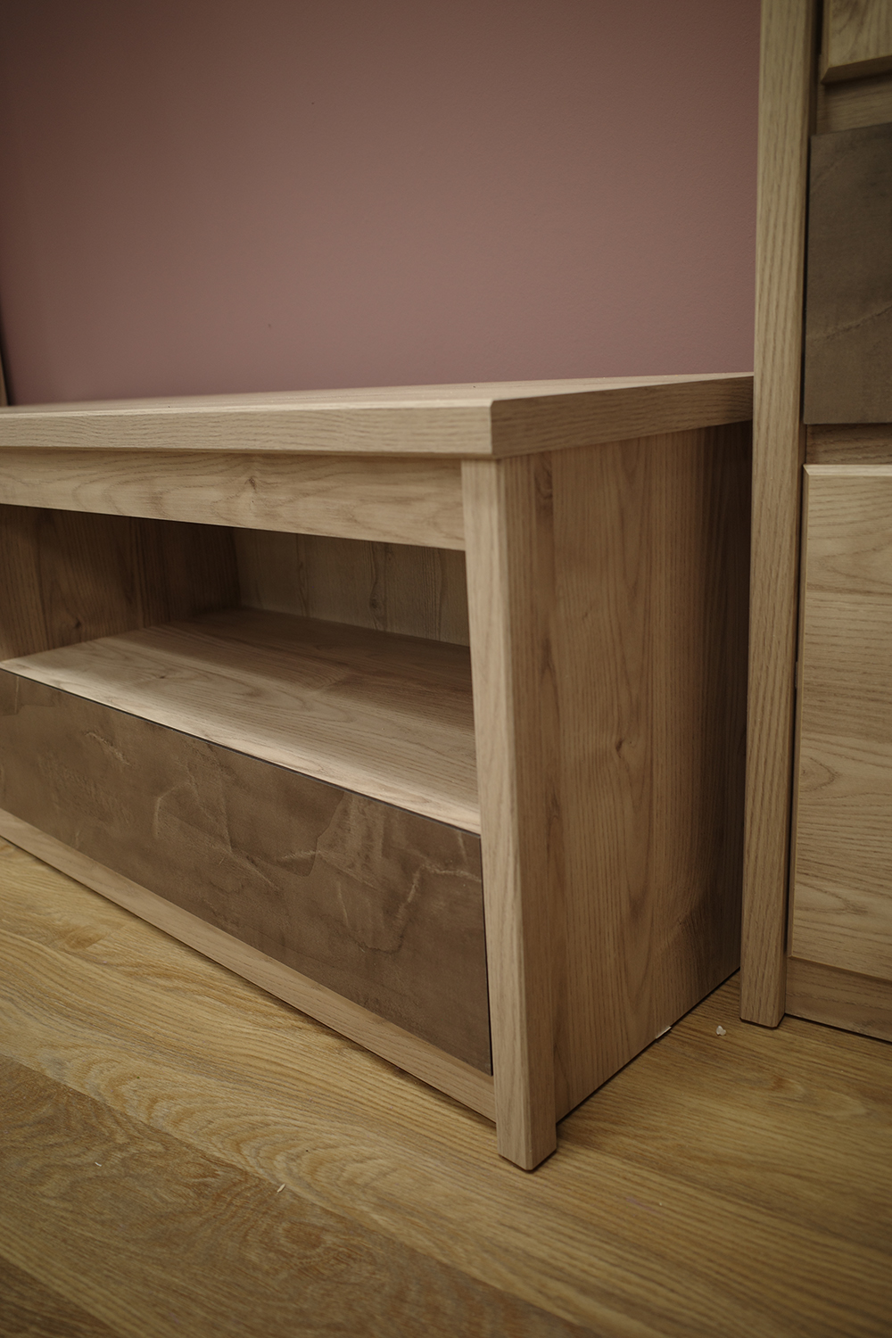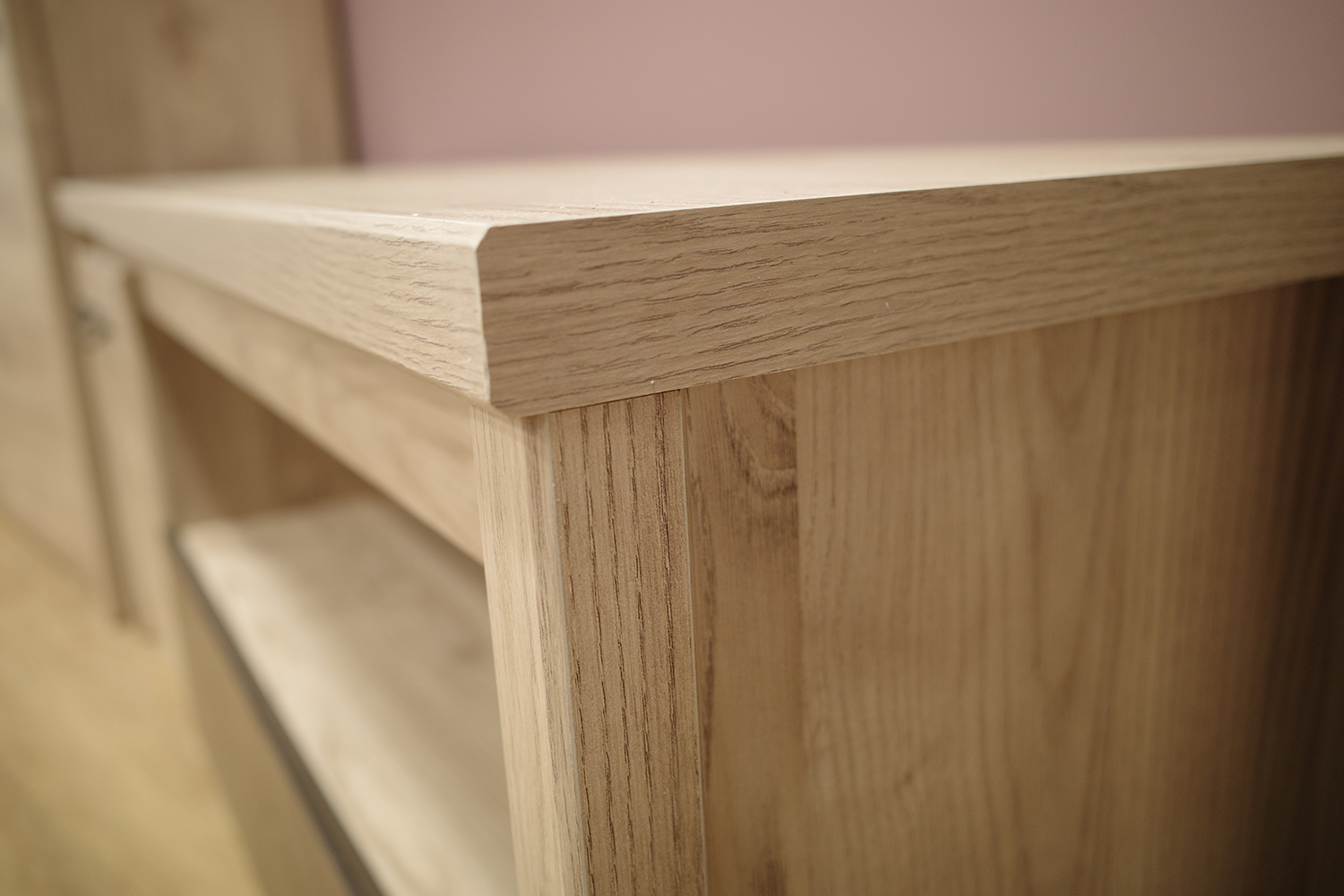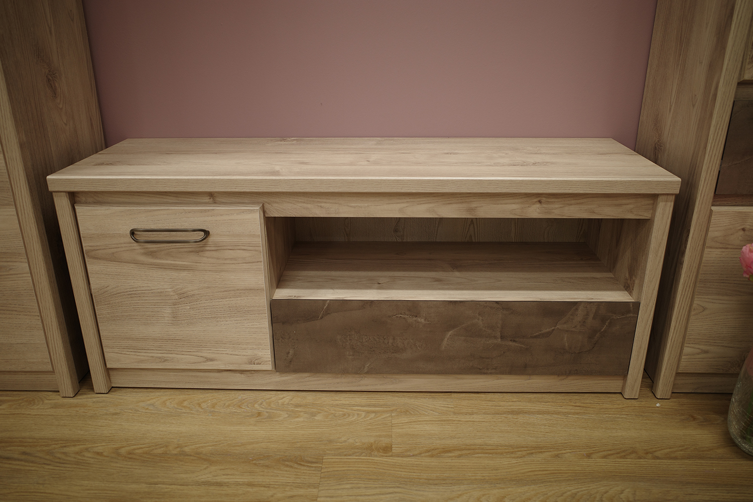 Тумба под телевизор Джаз имеет очень интересный дизайн, благодаря которому сразу же обращает на себя внимание и может стать акцентом в интерьере гостиной или столовой. Она отлично подходит для различной техники и других вещей. На длинной столешнице можно поставить цветок в вазоне, рамку с фото, красивую статуэтку. Данная модель имеет привычный дизайн, новые нотки в который вносит цвет беленый дуб. Корпус тумбы сделан из МДФ.