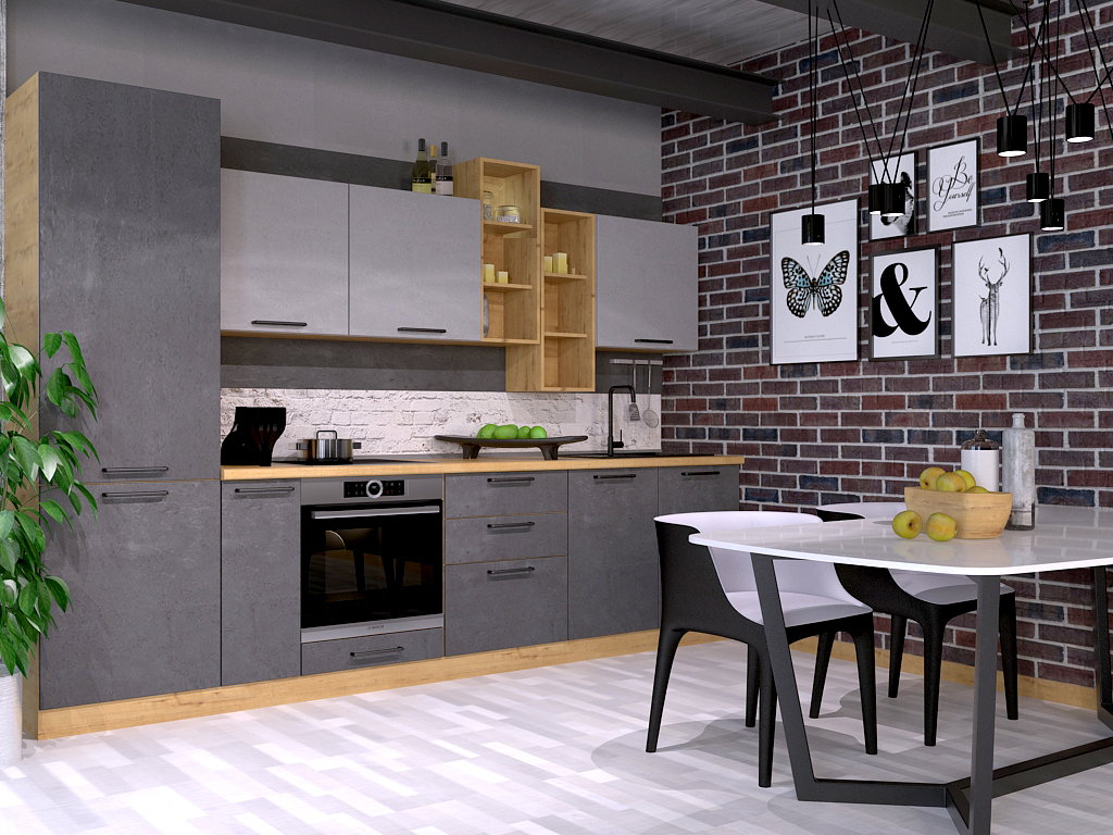 Кухня Чикаго 6 с искусными фасадами подарит хорошее настроение любой хозяйке. Для фасадов этой модели используются цвета серый и вяз, тем самым задав интересные акценты. Покрытия имитируют фактуры природных материалов. Все это создает атмосферу умиротворения. Отсутствие лицевой фурнитуры на верхних модулях формирует стильный дизайн, визуально расширяет помещение. За кухней легко ухаживать. Прямые кухни не занимают много места и оставляют пространство, в котором можно обустроить уютную обеденную зону. Если вы любите атмосферу спокойствия, свежести и утонченности в доме, то использование серого цвета в интерьере кухни будет беспроигрышным решением. Кухня в стиле лофт – довольно популярная тенденция, она уходит своими корнями в эстетику старых складов, где хранились промышленные материалы или продукты. На кухне на первый план выходит индустриальное творчество. Покрытие фасадов матовое - это означает, что фасады не оставляют отпечатков пальцев и очень легки в уходе.