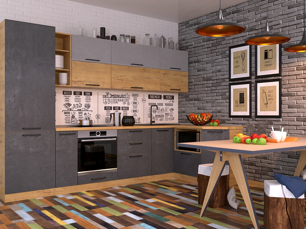 Гарнитур Чикаго 7 выглядит поистине очаровывающе. Любая линия в нем идеальна и неповторима. Фасады выполнены по оригинальной технологии, специальное покрытие делает цвет глубоким и позволяет легко ухаживать за поверхностью. Столешница и декоративные панели органично сочетаются с утонченным дизайном кухни. Это все позволяет преобразить вашу кухню в чудесный зал для приема гостей. Угловая планировка очень удобна. Она будет уместна и в большом, и в маленьком помещении. Такая кухня представляет собой треугольную зону где мебель и техника располагаются у смежных стен. Если вы любите атмосферу спокойствия, свежести и утонченности в доме, то использование серого цвета в интерьере кухни будет беспроигрышным решением. Интерьер кухни в стиле лофт подойдет для ценителей пространства оупенспейс. Однако его можно зонировать с помощью различных ширм и перегородок. Иногда таковыми выступают предметы мебели. Например, барная стойка может не только визуально, но и функционально разделить помещение. Она объединяет в себе элементы кухонного острова и обеденного стола. Дополнить ее можно барными стульями из дерева и металла, а также подвесными металлическими светильниками. Покрытие фасадов матовое - это означает, что фасады не оставляют отпечатков пальцев и очень легки в уходе.