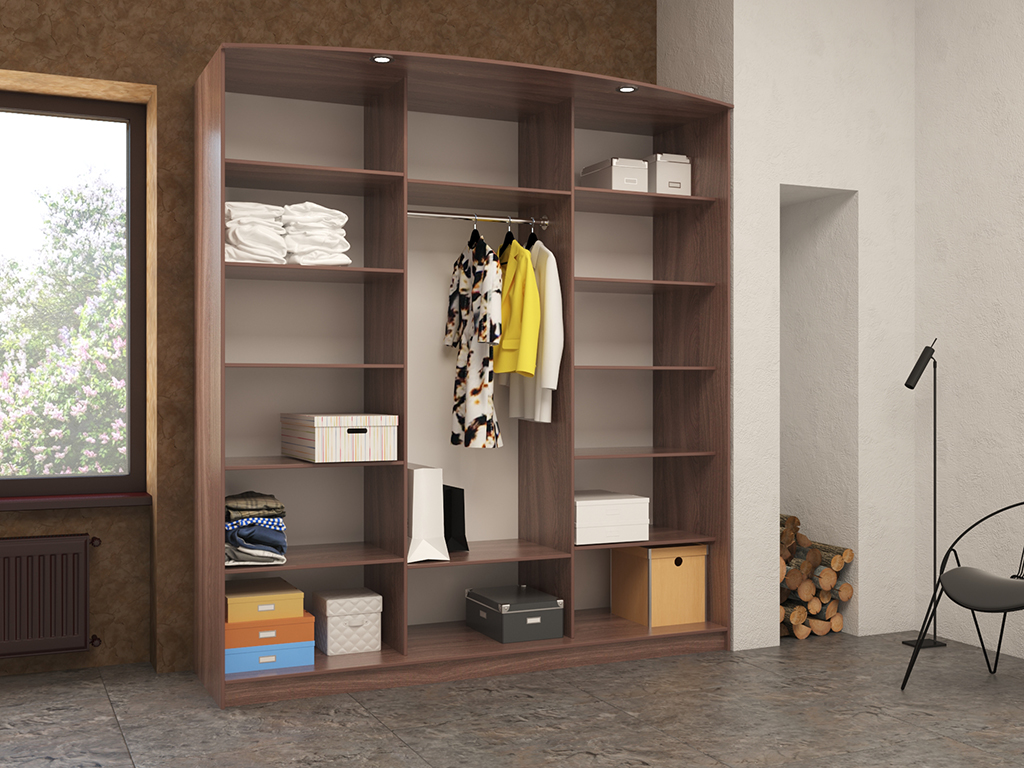 Шкаф-купе модель 2 отличается продуманным внутренним наполнением. В нем предусмотрено просторное отделение со стационарной штангой для бережного размещения одежды на плечиках, вместительные боковые полки, секции внизу и удобные антресоли - Ваша одежда будет храниться с максимальной заботой о внешнем виде. Используемая система раздвижных дверей обеспечивает комфортный доступ к вещам и экономит пространство помещения. Для этой модели используется цвет итальянский орех.